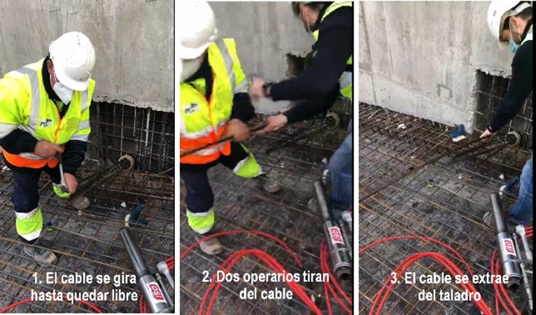 REMODELING OF THE SANTIAGO BERNABEU STADIUM (screen wall anchors): Recoverable anchors for concrete protection screens for buildings basements. It has been certified as "TECHNOLOGICAL INNOVATION" thanks to the help and collaboration of the staff of the Bernabéu work and the Technical Services directorate. The technological innovation proposed in the project consisted of an anchoring system that combines the geotechnical qualities of a compression anchor with a simple method of recovery of the anchor armor. This is the QUICK-EX anchor. The steel cables are wrapped by a high-density polyethylene (HDPE) tube along the entire length of the anchorage and are assembled at the distal end inside a metal cylinder with threaded holes, called the anchor foot.