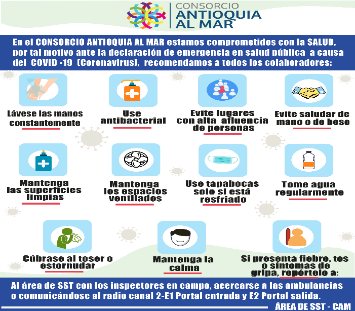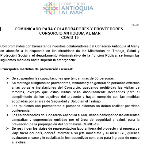- Dissemination of the internal communication of the Antioquia Consortium to the Sea, announcing prevention measures for the Covid - 19 virus.