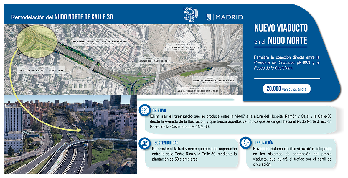 This solution will allow the direct flow of all the traffic coming from the M-607 from areas as densely populated as Tres Cantos, Montecarmelo, Mirasierra or Herrera Oria, and who want to go to Paseo de la Castellana. Likewise, the vehicles that circulate along Calle 30 from Av. De la Ilustracion, will continue along it without any type of interference, and can in turn go to La Castellana through the exit currently in use, in the surroundings of the Hospital de la Peace.