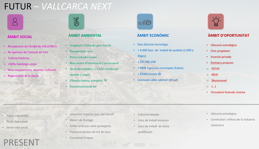 The Vallcarca project will generate more than 4,420 jobs and 315 million euros in Catalonia, according to a socioeconomic impact study prepared by the consulting firm Deloitte. For the local economy of the municipality of Sitges, the development of the project would generate an impact of around 115 million euros and 2,420 jobs derived from the activities of companies, located outside of Sitges, suppliers of goods and services to companies in Vallcarca, or workers who reside abroad, among others.