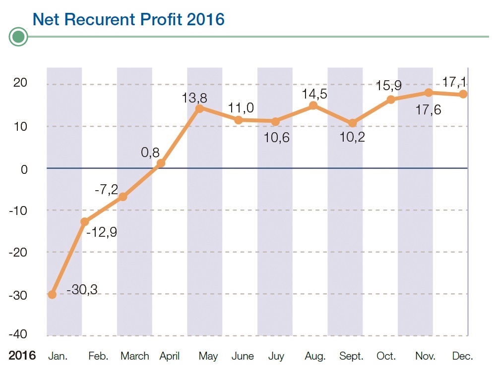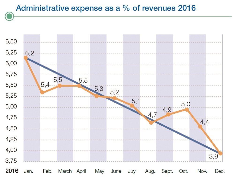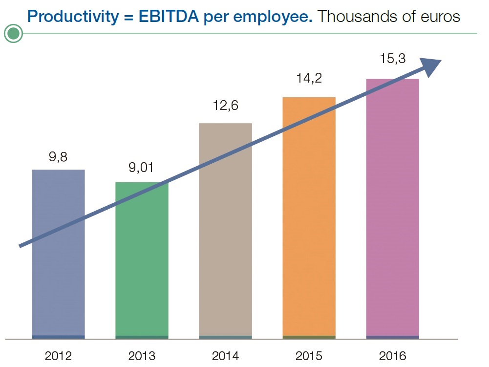 As a proportion of income, the administrative costs dropped from more than 6.2% in January 2016 to less than 4% in December of the same year. The productivity measurement (EBITDA generated per employee) increased by +56% in the last four years compared to the reduction in productivity of -38% reached by the sector in the same period. In this aspect, the Managing Director urged the directors to continue improving productivity in all areas.