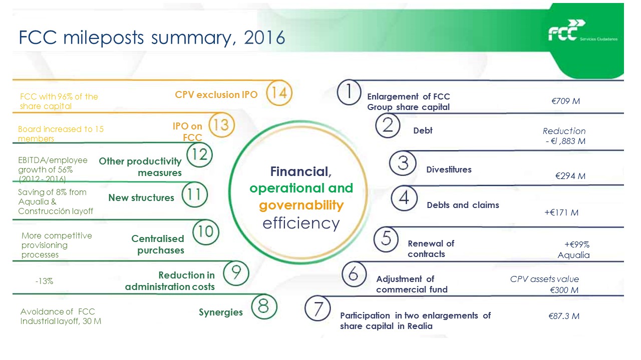The FCC Group CEO stated that, “despite the progress of previous years, 2016 was a year of challenges for the Group since at the global level, the economic performance was heterogeneous by region with some of them in full recession. At the local level there was a recession on infrastructure works in Spain and a fall in the consumption of water and waste collection, and at the FCC Group level there was still an onerous structure of expenses, high financial leverage and persistent losses.”