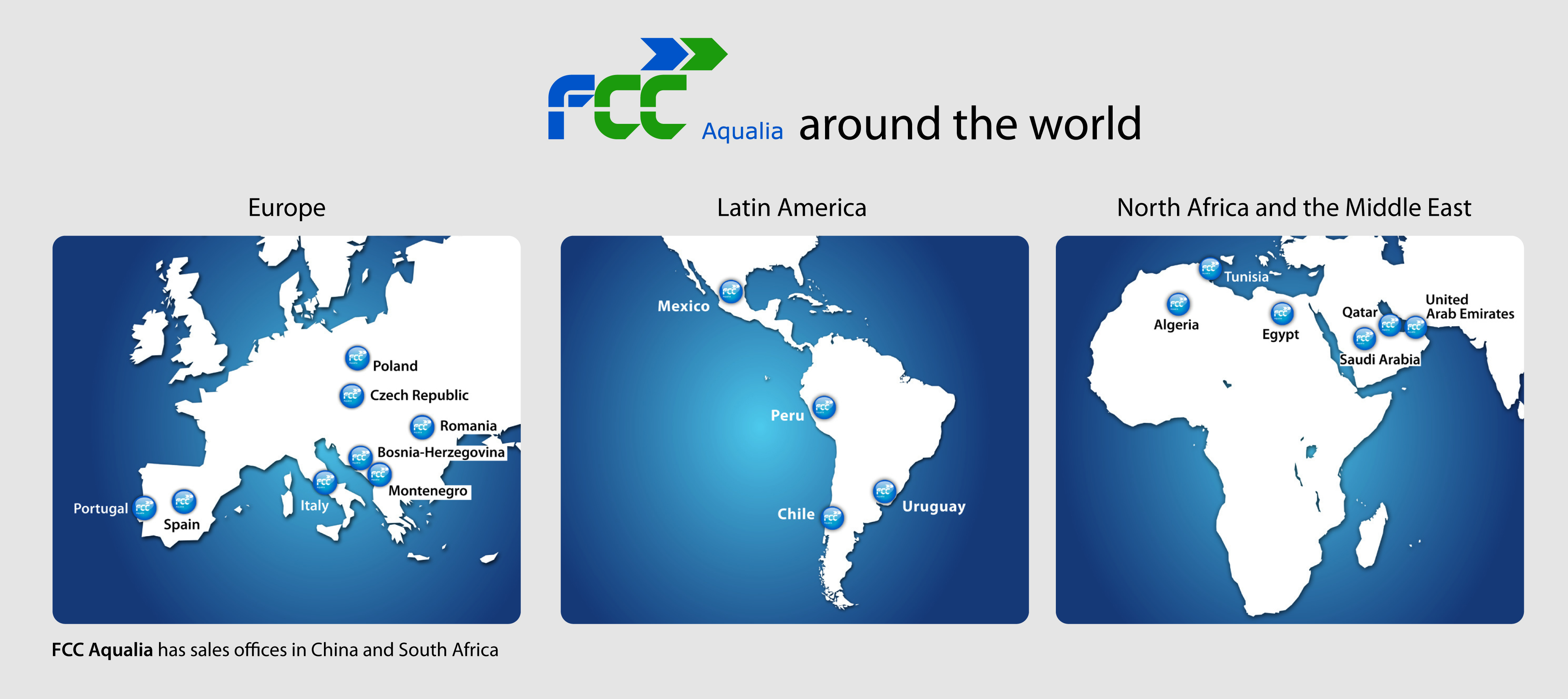 It currently provides service to 1100 towns in 20 countries: Spain, Italy, Portugal, the Czech Republic, Poland, Romania, Montenegro, Bosnia, Mexico, Peru, Chile, Uruguay, Algeria, Egypt, the United Arab Emirates, Saudi Arabia, China, Tunisia and now Qatar. FCC's water management subsidiary has revenues of EUR 950 million (2013 year-end) and last year reached a record business portfolio of more than EUR 14,000 million.