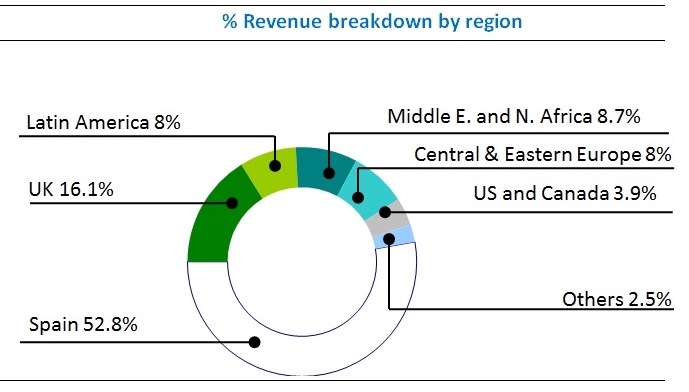 This improvement to the income statement is based on the positive development of revenue, with a year-on-year increase of 4.4% reaching €4.792 billion. It is driven by a 14.7% increase of activity in international markets where growth of more than double digits in all business areas is reported. Revenue in Spain slipped by 3.4% to €2.5281 billion. This is mainly due to a 14.6% decrease of domestic revenue for FCC Construction as a result of the continuing decline in public investment in infrastructure.