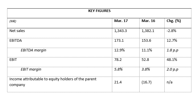 Group revenues declined by -2.8% in the first quarter of 2017 to €1,343.3 million, mainly as a result of the deconsolidation of the Cement business in the US initiated in November 2016 and of the impact of sterling. Adjusting for both effects, FCC Group revenues would have increased by +2.2% year-on-year in the first quarter.