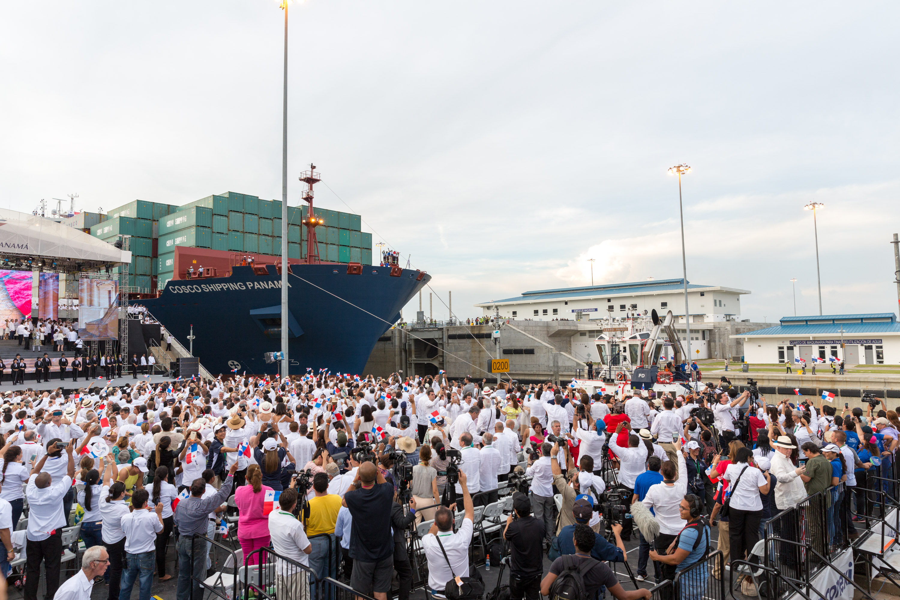 The President of the Republic, Juan Carlos Varela, accompanied by the Minister of Canal Affairs, Roberto Roy, the CEO of the Panama Canal, Jorge Luís Quijano, toguether with representatives from more than 60 delegations from all over the world and thousands of Panamanians witnessed the passage of the first New Panamax ship, “Cosco Shipping Panamá”, of Chinese origin, with a load of 9,400 containers.