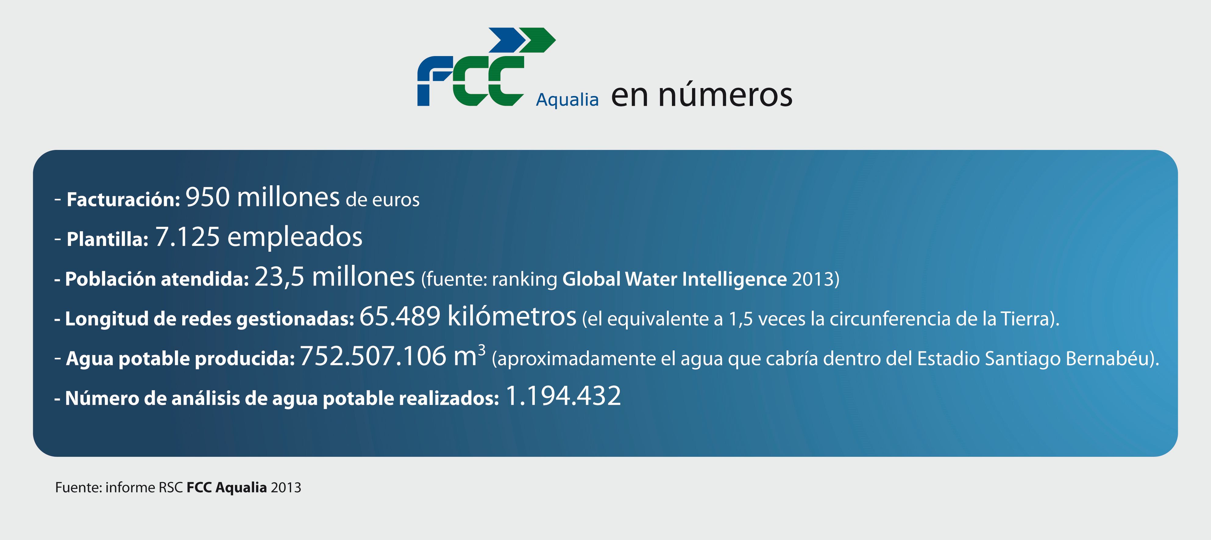 FCC Aqualia es la empresa de gestión del agua de FCC, uno de los grupos de servicios ciudadanos líderes en Europa. La compañía es la primera española de su sector, la tercera empresa privada de agua de Europa y la sexta en el Mundo, según el último ranking de la publicación especializada Global Water Intelligence (GWI), y atiende a 23,5 millones de usuarios.