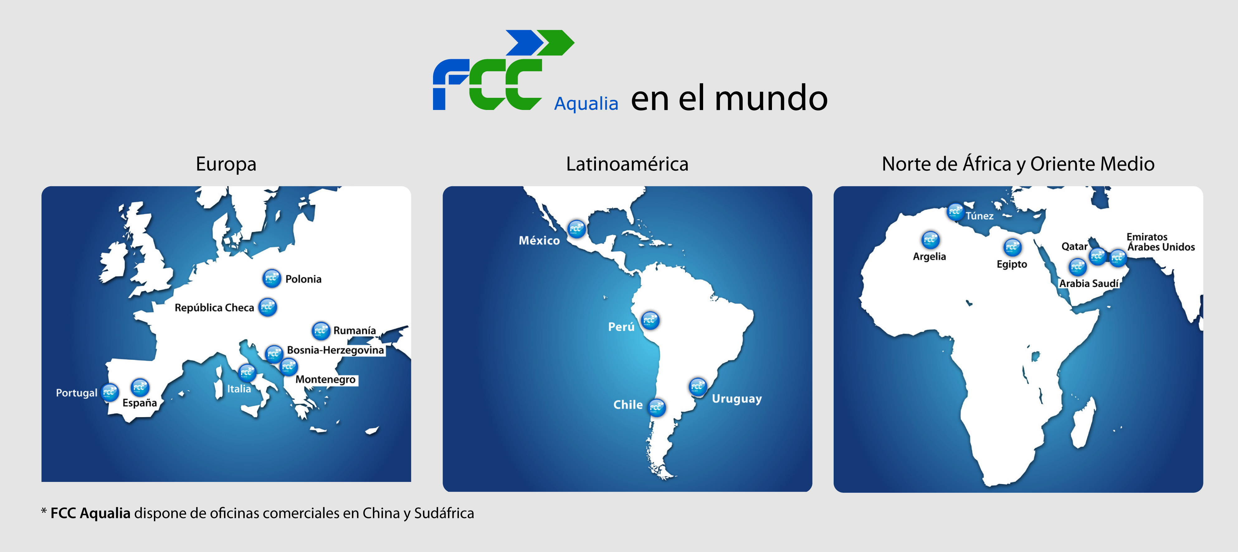 En la actualidad presta servicio en 1100 municipios de 20 países: España, Italia, Portugal, República Checa, Polonia, Rumanía, Montenegro, Bosnia, México, Perú, Chile, Uruguay, Argelia, Egipto, Emiratos Árabes Unidos, Arabia Saudí, China, Túnez, Uruguay y, a partir de ahora, también en Qatar. La filial de gestión del agua de FCC factura 950 millones de euros (cierre de 2013) y el pasado año alcanzó una cartera de negocio récord de más de 14.000 millones de euros.