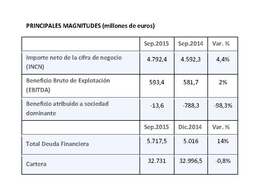 En el resultado de las actividades continuadas destaca la reducción de gastos financieros netos en un 27%, explicado fundamentalmente por el aumento de capital llevado a cabo en diciembre de 2014 y el cual repercutió en una reducción de deuda, que sin embargo aún se encuentra en niveles altos.