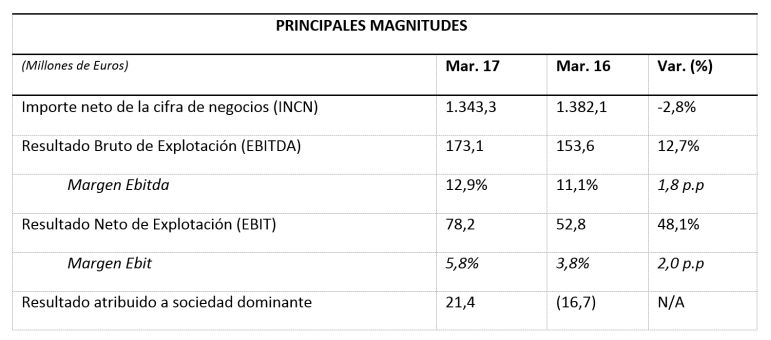 El beneficio neto alcanzó 21,4 millones de euros en el primer trimestre frente a las pérdidas de -16,7 millones de euros en el mismo período que el año anterior, a pesar de que este último incluía importantes extraordinarios positivos (Realia y otras participadas). Este resultado supone un radical cambio de tendencia por la progresiva visibilidad en el aumento de la eficiencia y rentabilidad, tanto operativa como financiera, de las operaciones del Grupo.