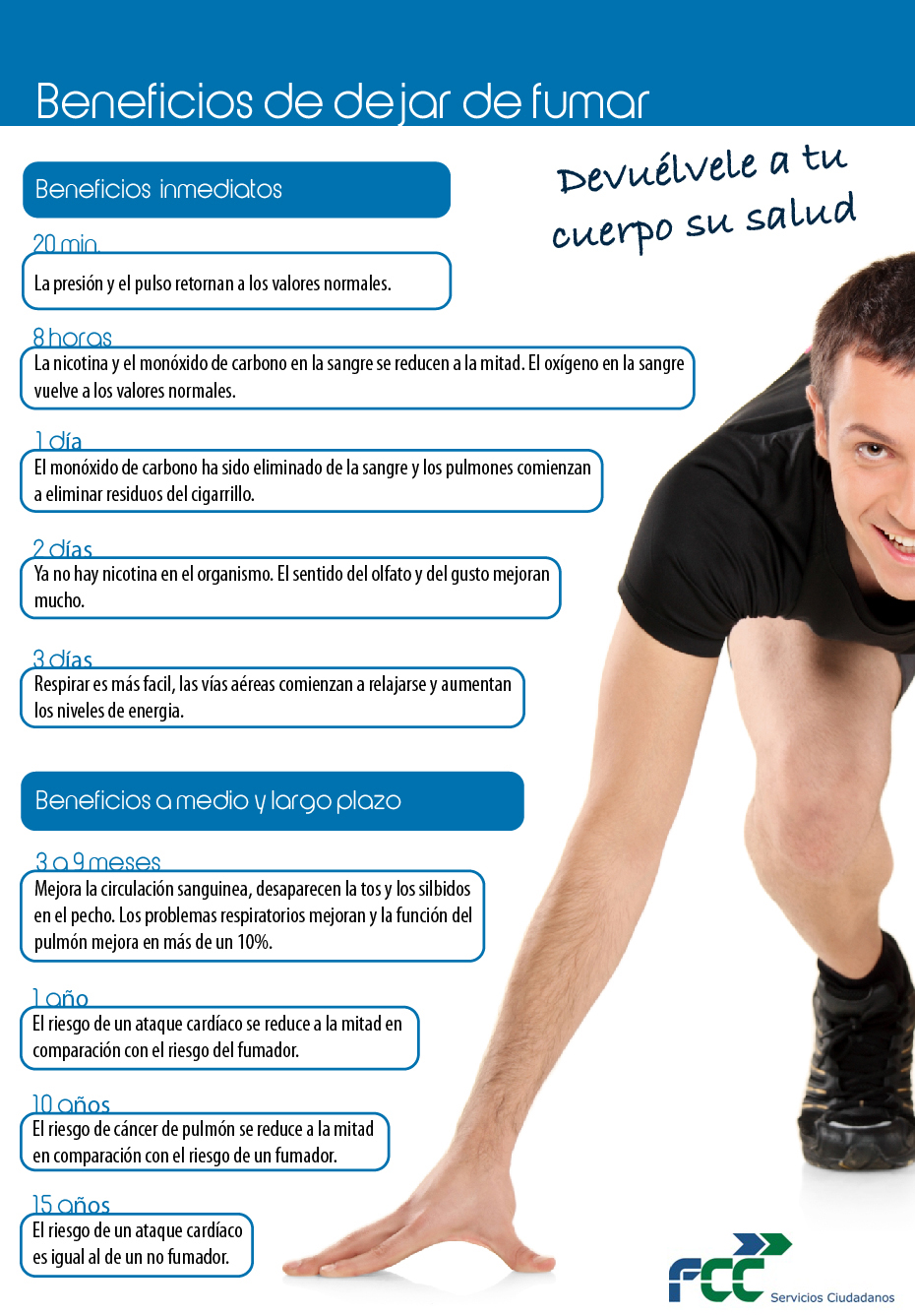 Abandonar el consumo del tabaco repercute en una mejora sustancial de la calidad de vida, desde la perspectiva de la salud y la economía. Recuperar la capacidad pulmonar, el sentido del gusto y del olfato, los efectos positivos sobre la piel y la salud dental y la radical reducción de las posibilidades de desarrollar problemas de salud del sistema cardiorrespiratorio son algunos de los importantes beneficios que la Organización Mundial de la Salud destaca con el fin de abandonar el hábito del tabaquismo.