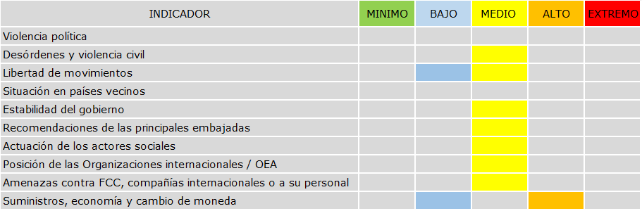 Los indicadores son examinados y discutidos por el personal de FCC que forma parte de los comités de crisis y sirven para establecer el nivel de alerta vigente en cada momento en un determinado país o proyecto.